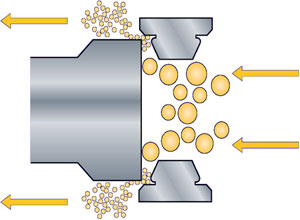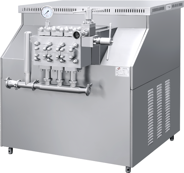生产型均质机主要工作是通过柱塞往复运动将被加工物料以高压的形式送至均质阀,使物料流经阀头与阀座间微小的隙瞬受到湍流、空穴、撞击、剪切等复合的作用,将原先粗糙的乳浊液或悬浮液加工成极细微的、均匀稳定的液与液相混乳化物或液与固分散物。